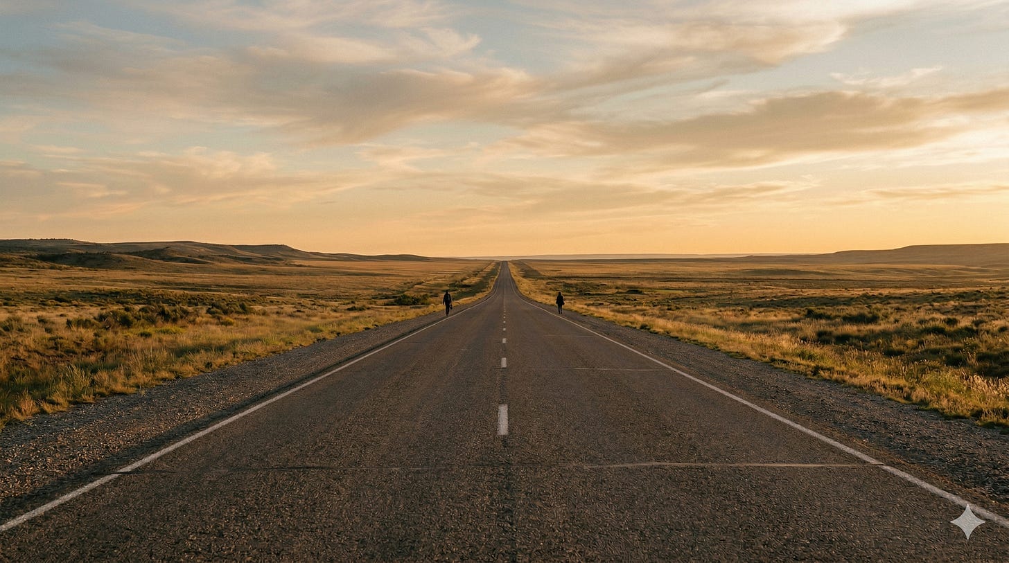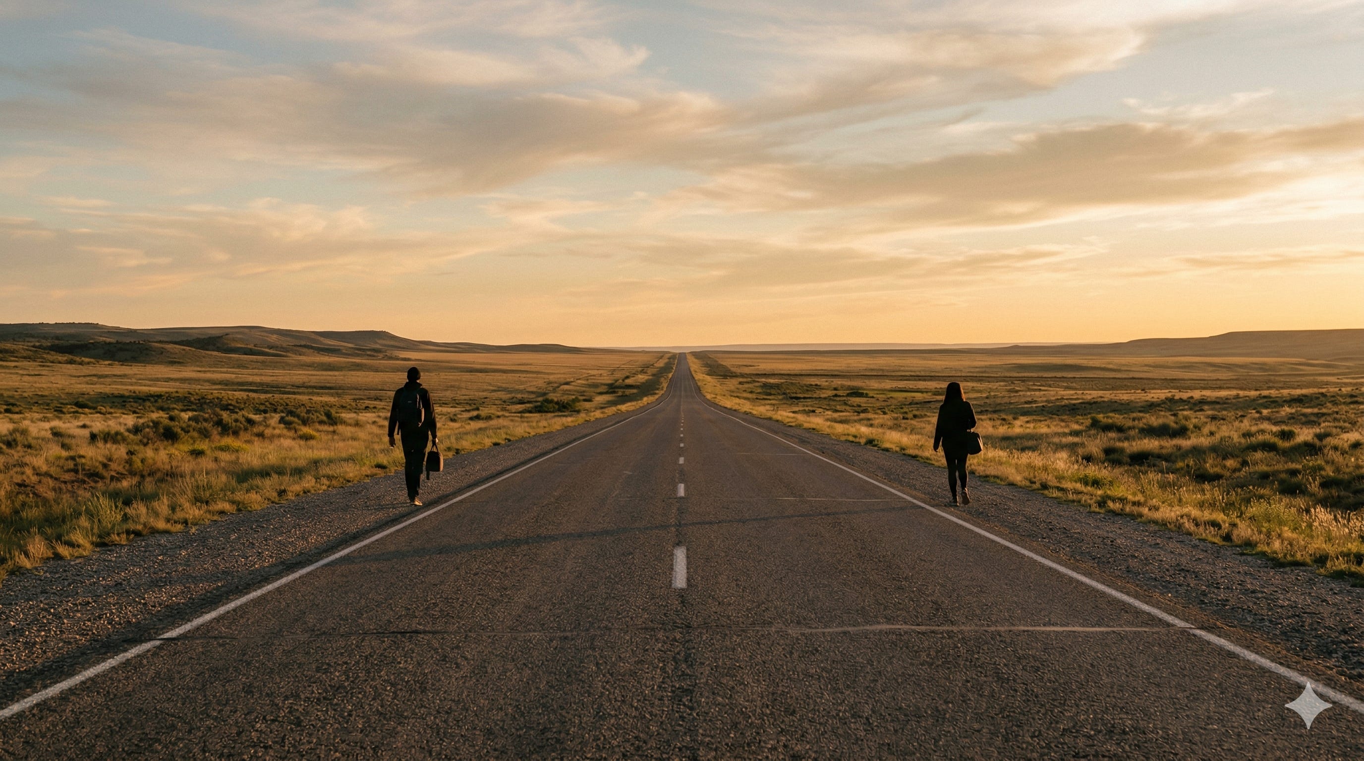 Imagina uma estrada longa em perspectiva. Aquelas que vão afunilando no horizonte. Se você olhar perto de você, duas pessoas caminhando, cada uma em um lado da estrada, parecem distantes uma da outra. Mas lá na frente, elas estão juntas. Quase no mesmo ponto.